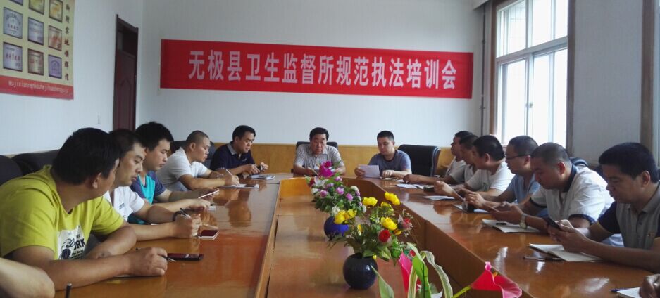 为进一步完善无极县卫生监督执法体系,加强卫生监督力度,提高卫生监督员的业务素质和执法水平,推进全县卫生监督工作有效开展,7月8日,在无极县卫生和计划生育局二楼会议室,组织全体卫生执法人员召开规范执法培训会。