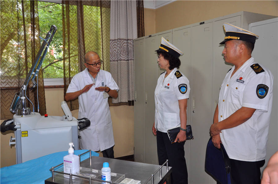 8月18日上午,石家庄市卫生监督局局长王云、副局长杨永革带队赴石家庄市第一医院督导调研我市打击非法美容“亮剑”专项行动开展情况。