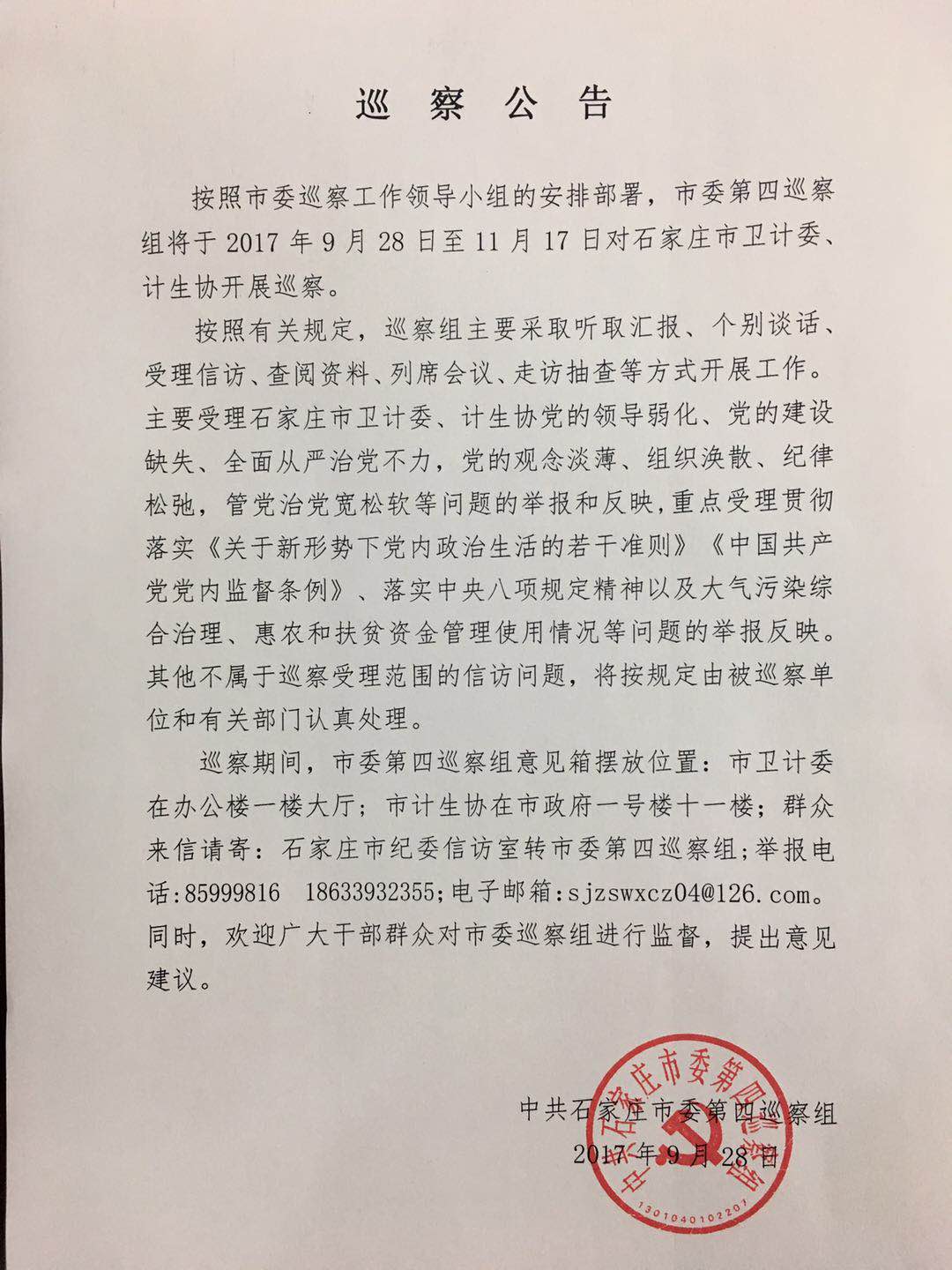 按照市委巡察工作领导小组的安排部署,市委第四巡察组将于2017年9月28日至11月17日对石家庄市卫计委、计生协开展巡察。